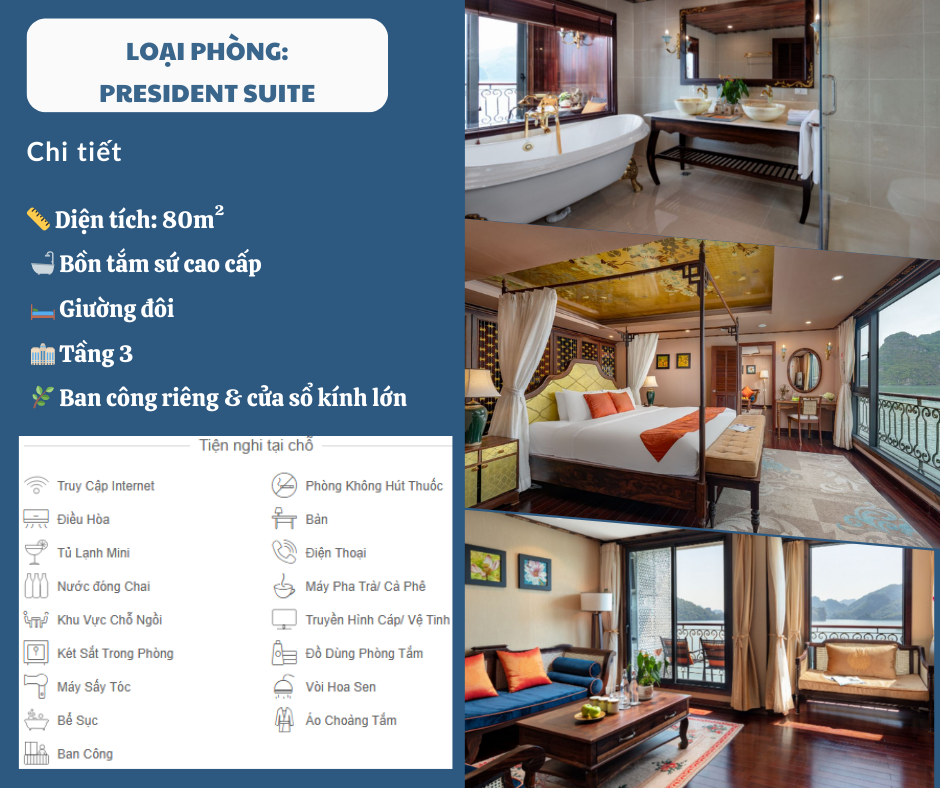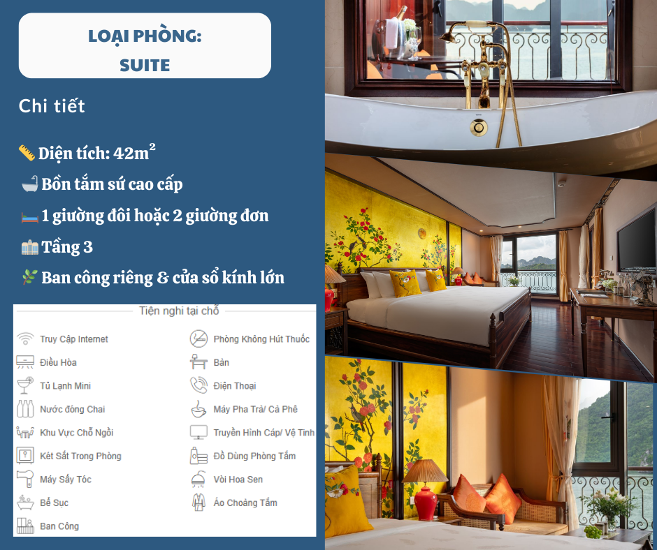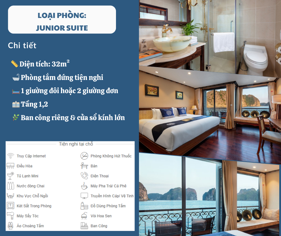 Ra mắt vào năm 2019, du thuyền Indochine mang đến trải nghiệm tuyệt vời cho tất cả 110 hành khách. Kích thước tuyệt vời của du thuyền khiến đây trở thành một trong những du thuyền thép rộng rãi nhất ở Vịnh Lan Hạ, và du khách sẽ tận hưởng một hành trình khó quên đến một loạt các điểm tham quan hấp dẫn & yên tĩnh trong sự thoải mái hoàn toàn. Indochine Cruise có 43 phòng, chắc chắn sẽ là du thuyền sang trọng nhất trên vịnh Lan Hạ. Mỗi cabin được xây dựng bằng gỗ sồi quý, với cửa sổ cao và ban công riêng để du khách có thể tận hưởng tối đa tầm nhìn tuyệt đẹp. Được thiết kế bởi hành khách, một thiết kế tóm tắt giai đoạn nghệ thuật của lịch sử Việt Nam trong suốt thời kỳ thuộc địa gợi cảm