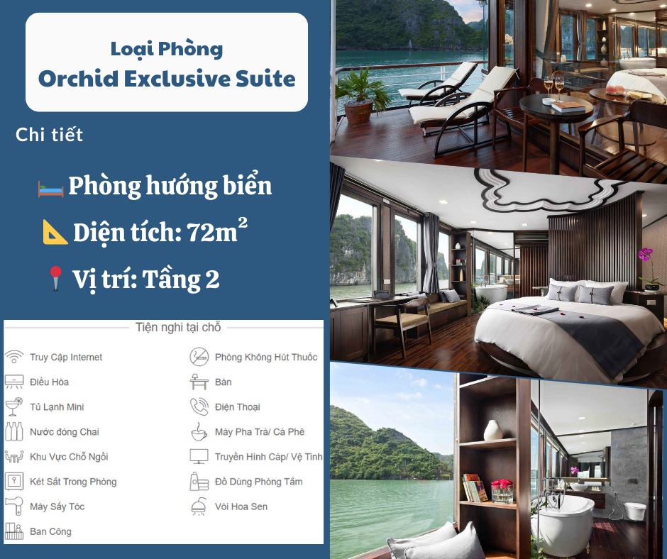 Du thuyền Orchid 5 sao thuộc tập đoàn du thuyền Pelican, với hình tượng 3 cánh buồm với hình hoa lan đặc trưng, du thuyền Orchid là sự kết hợp hoàn hảo giữa thiết kế truyền thống và hiện đại, sừng sững giữa biển khơi giữa vịnh Lan Hạ xinh đẹp thơ mộng.Nội thất bên trong du thuyền toát lên vẻ thanh lịch, hiện đại với gam màu chủ đạo nâu và trắng. Với số lượng cabin khiêm tốn nhưng đầy đủ tiện nghi. Khi tham gia hải trình 2 ngày 1 đêm trên du thuyền Orchid quý khách sẽ có một kỳ nghỉ dưỡng cao cấp với ẩm thực hàng đầu được phục vụ món với thực đơn kiểu Việt – Âu.
