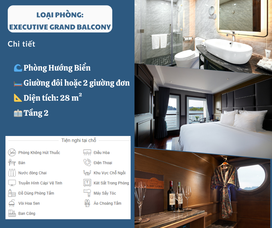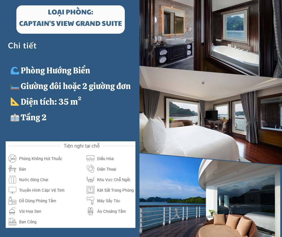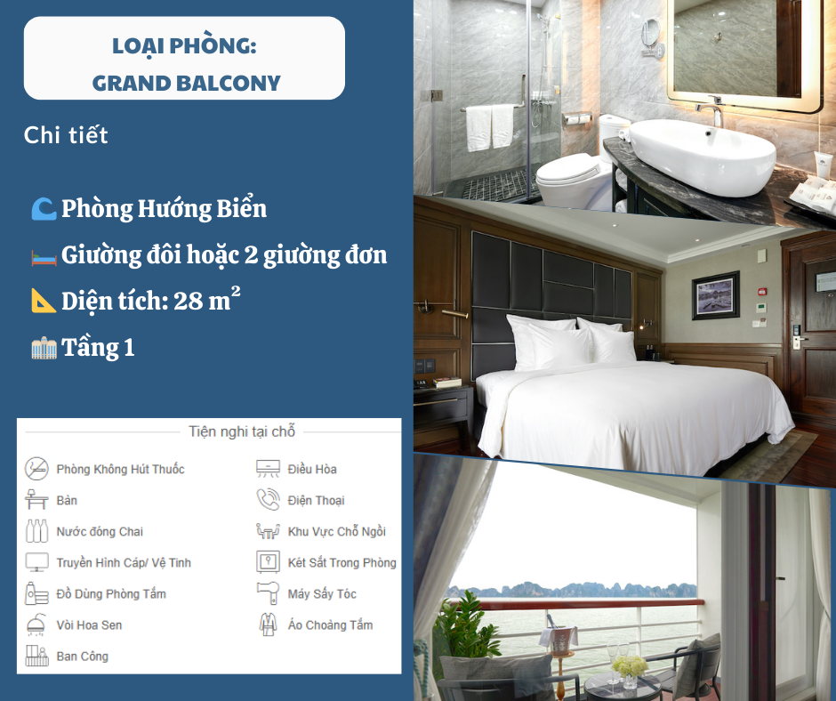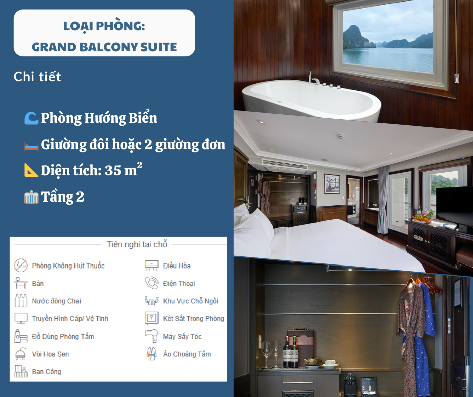 Du thuyền Paradise Grand là du thuyền hạng sang đầu tiên của tập đoàn Paradise trên vịnh Lan Hạ. Du thuyền gồm 39 cabin thiết kế sang trọng, trang nhã đạt tiêu chuẩn 5 sao, mỗi phòng đều có ban công riêng hướng vịnh rộng rãi.