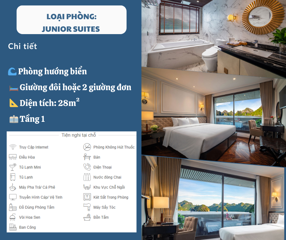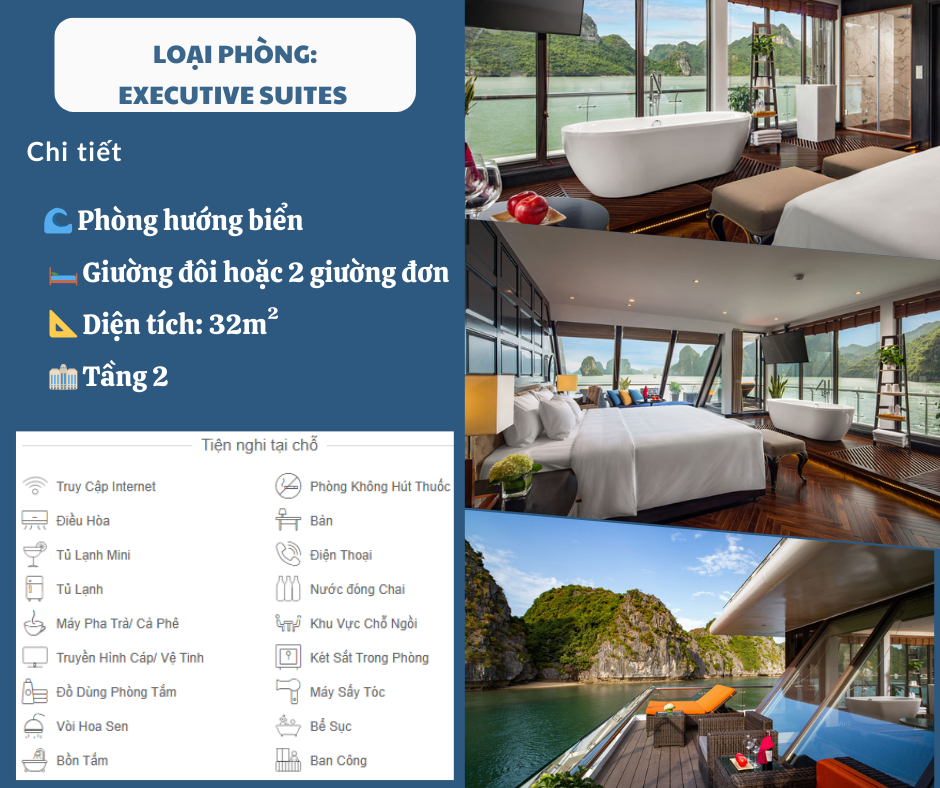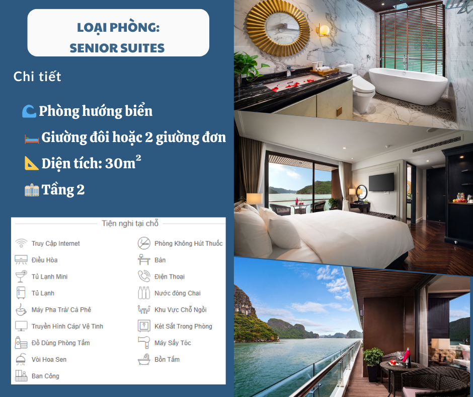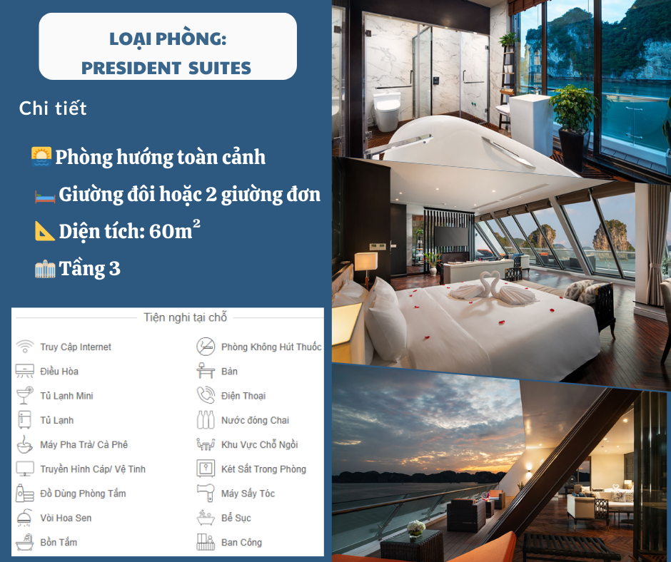 Du thuyền được thiết kế 4 tầng với 22 phòng nghỉ sang trọng, 4 hạng phòng khác nhau (Junior, Senior, Executive & President). Các phòng đều có ban công và phòng tắm riêng với hệ thống cửa sổ rộng. Trên du thuyền, nhà hàng sang trọng, quầy bar view toàn cảnh vịnh Lan Hạ, hầm rượu vang, sân golf, phòng massage và bể bơi là các tiện ích đẳng cấp chắc chắn sẽ làm bạn hài lòng.