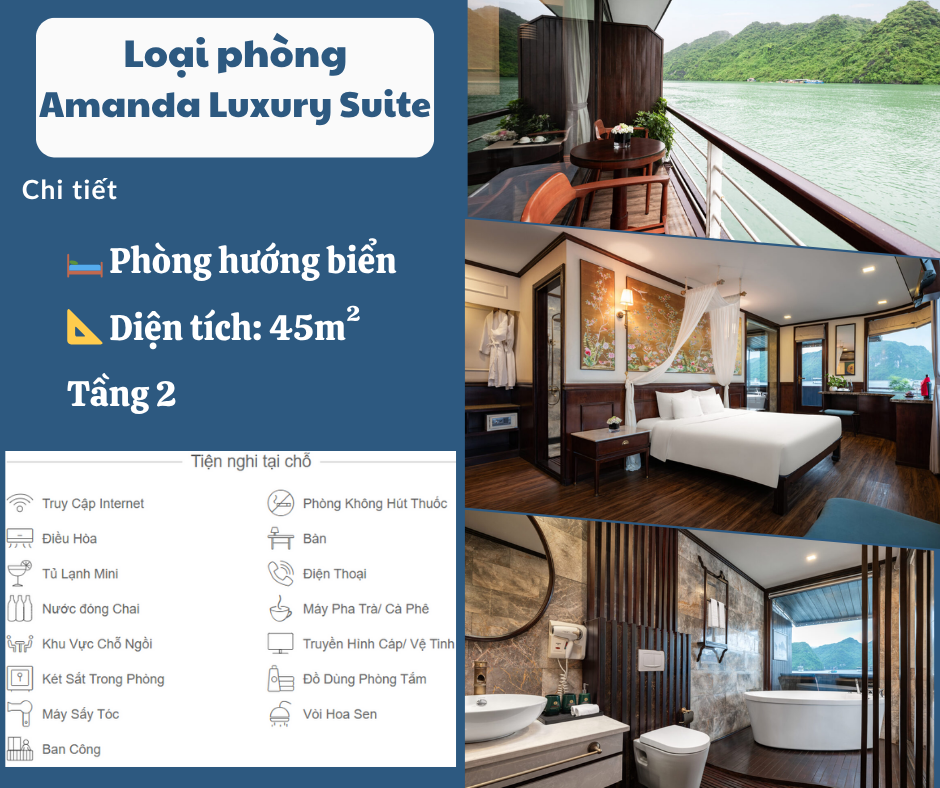 Khám phá vịnh Hạ Long trên du thuyền 5 sao Amanda Luxury Cruise 2 ngày là lựa chọn lý tưởng cho những du khách yêu thích trải nghiệm khám phá ngoài lộ trình quen thuộc, tìm hiểu văn hóa địa phương chân thực và chiêm ngưỡng những vẻ đẹp tiềm ẩn của vịnh Hạ Long và vịnh Lan Hạ.