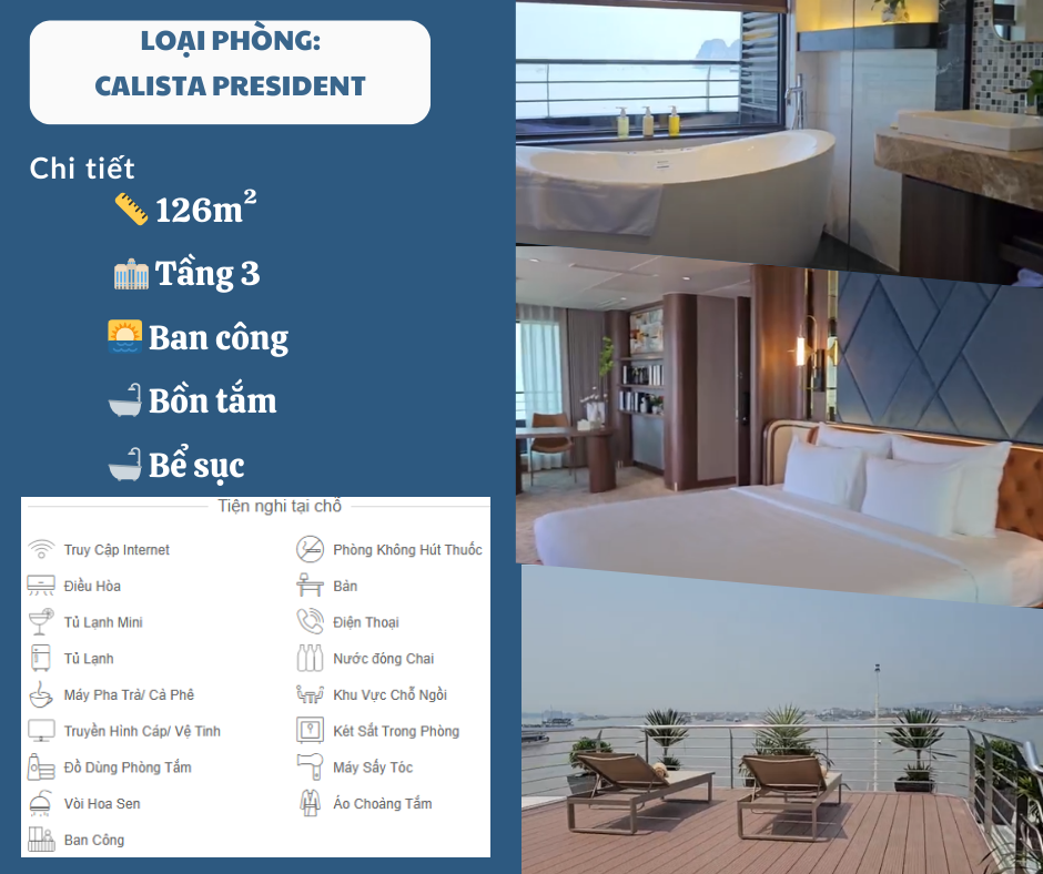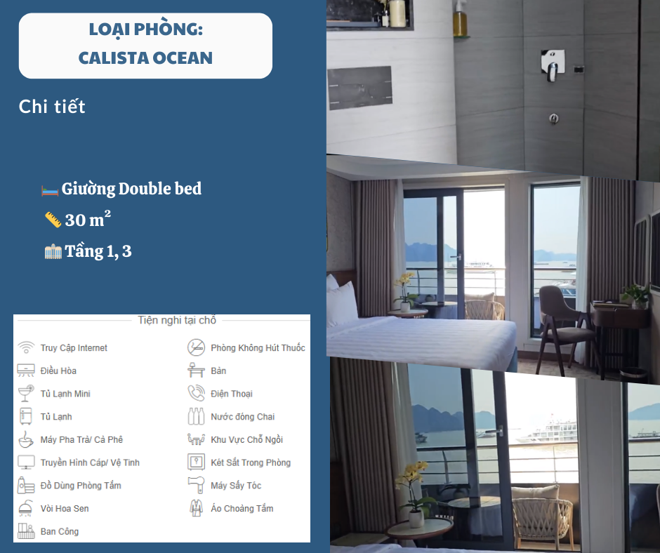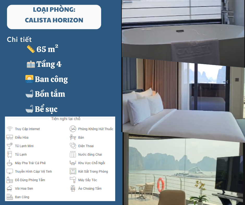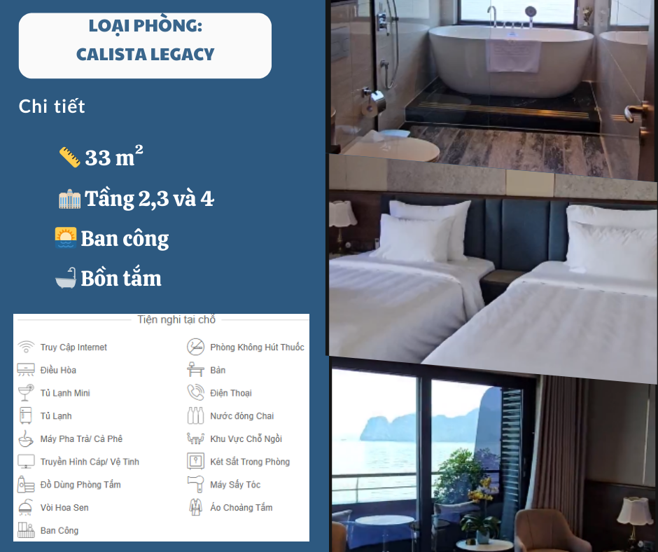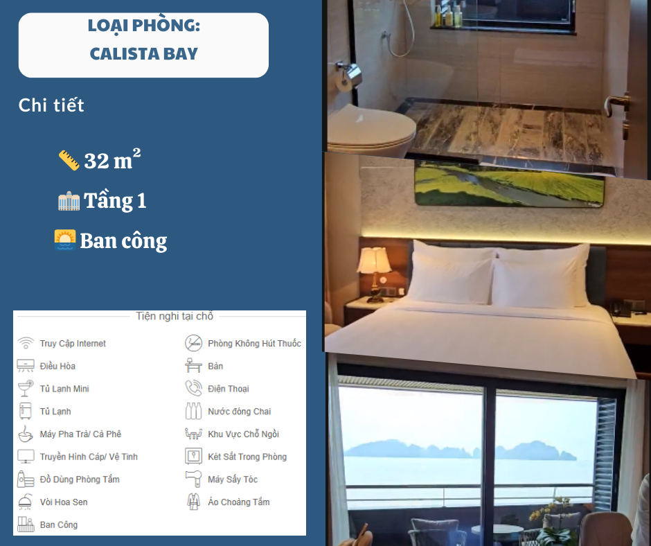 🔹 11:30 – 12:00: Arrive at Tuan Chau Port, check in to Calista Cruise. Enjoy welcome drinks and light cakes.