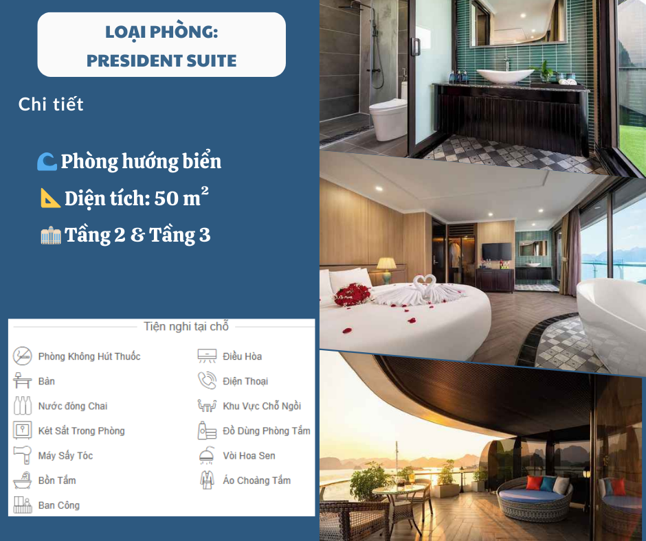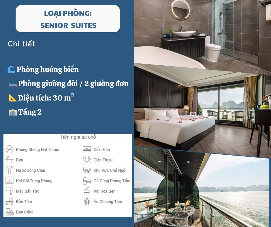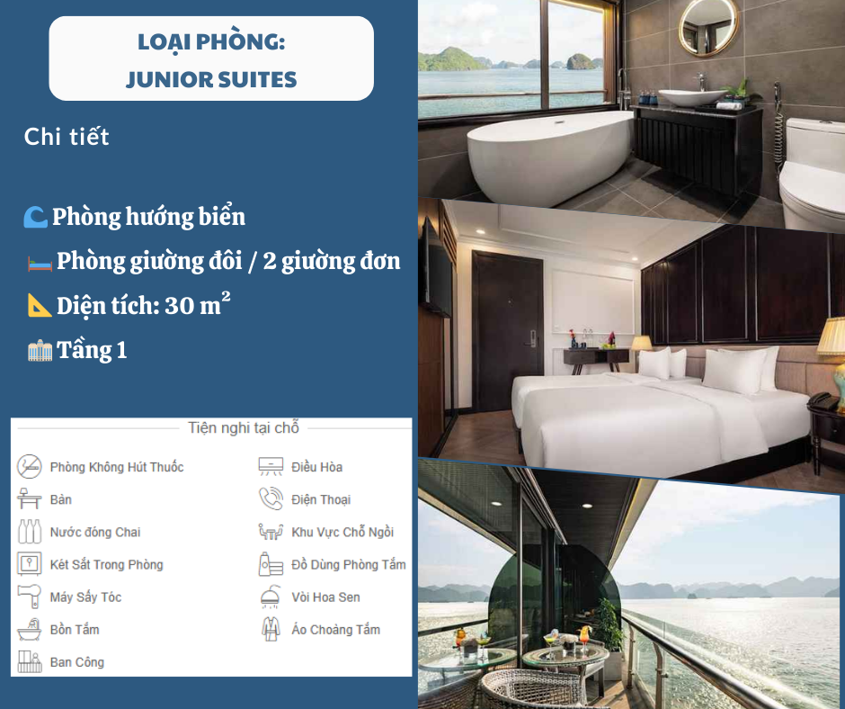 Du thuyền Doria mang đến một trải nghiệm sang trọng và thư giãn trên vịnh Lan Hạ tuyệt đẹp. Với các tiện ích đẳng cấp như bể sục jacuzzi, dịch vụ chèo thuyền kayak, và không gian lý tưởng để ngắm hoàng hôn, du thuyền Doria hứa hẹn mang đến cho du khách những giây phút thư giãn và khám phá tuyệt vời. Thưởng thức bữa ăn ngon miệng, tham gia các hoạt động giải trí thú vị và tận hưởng không gian nghỉ ngơi tuyệt vời giữa lòng vịnh Lan Hạ xinh đẹp!
