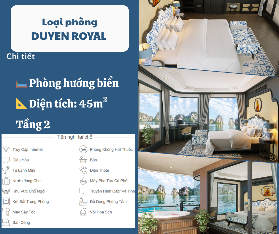 09:45 – Light lunch on board. Lunch is served on board while the cruise moves back to the harbor. 10:40 End of the journey. Leave Ha Long Du Yen cruise and travel by small boat back to the lounge of Du Yen cruise.