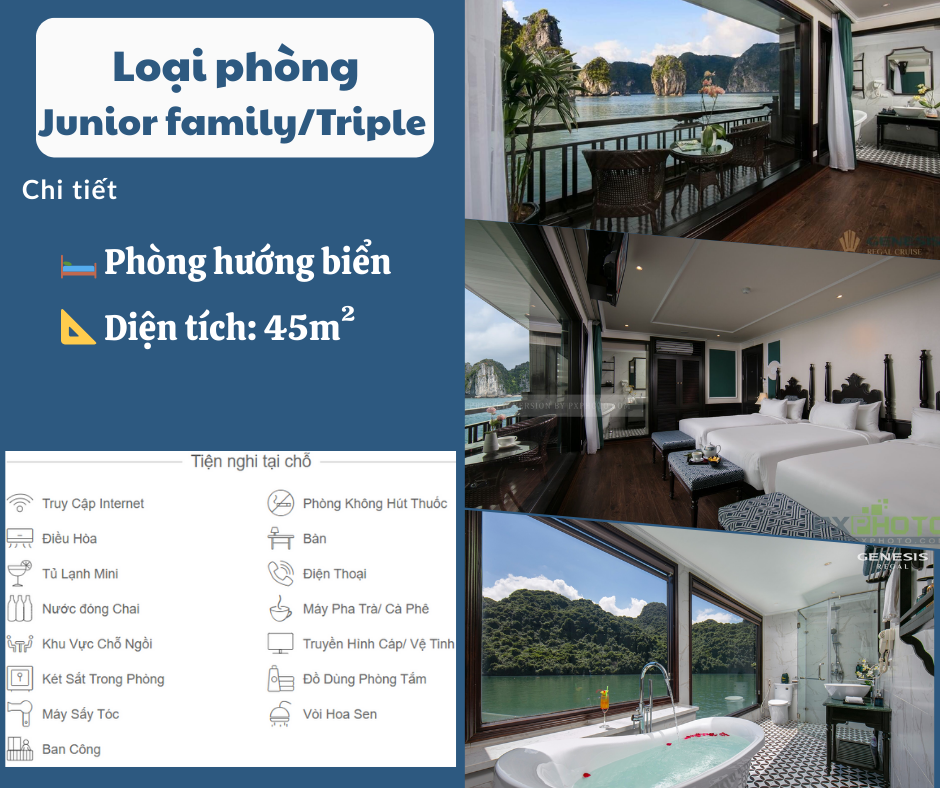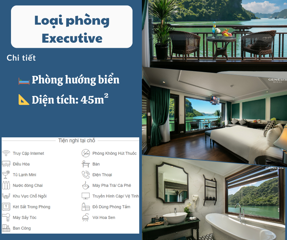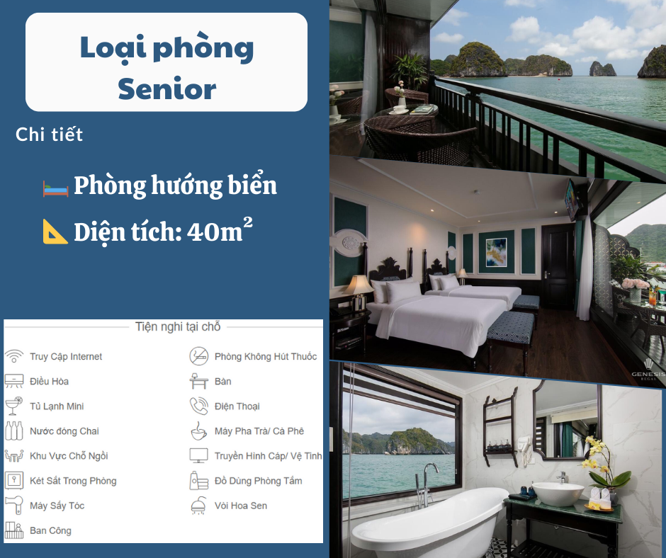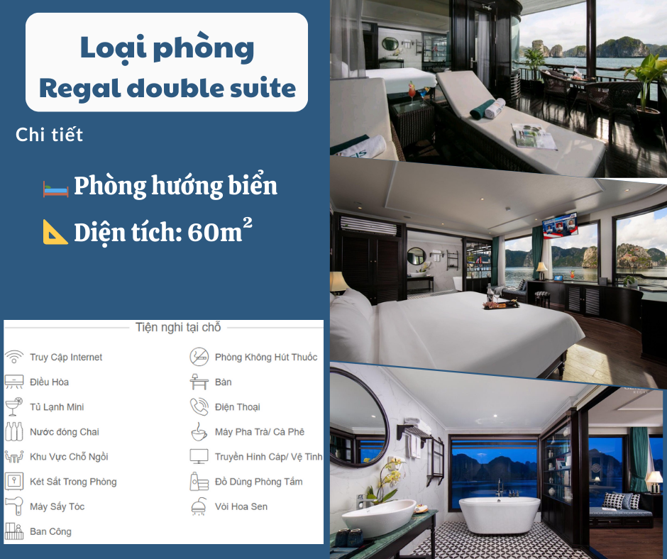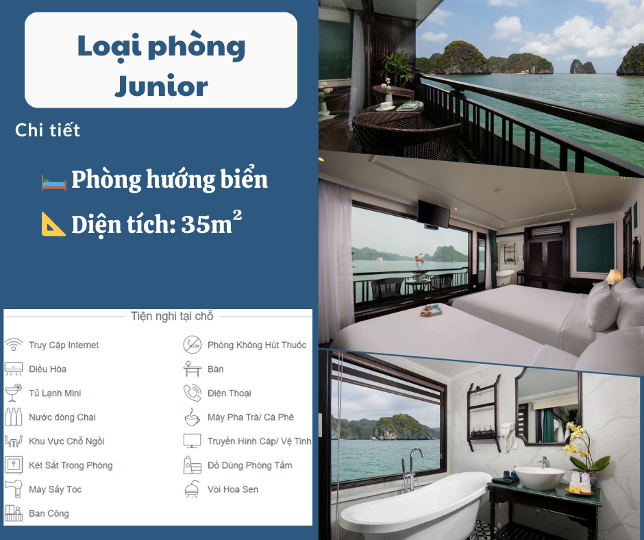 Phòng nghỉ trên du thuyền sang trọng tiêu chuẩn 5 sao (Full view hướng biển, bồn tắm đứng + nằm và ban công riêng từng phòng, Internet wifi, TV truyền hình vệ tinh).
