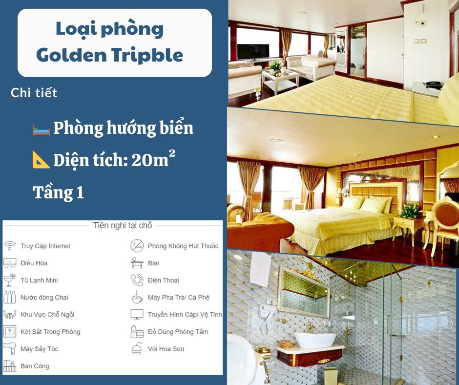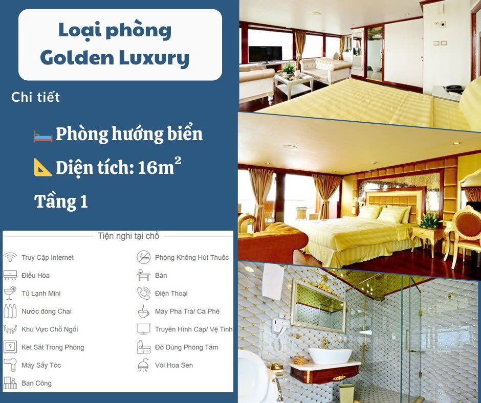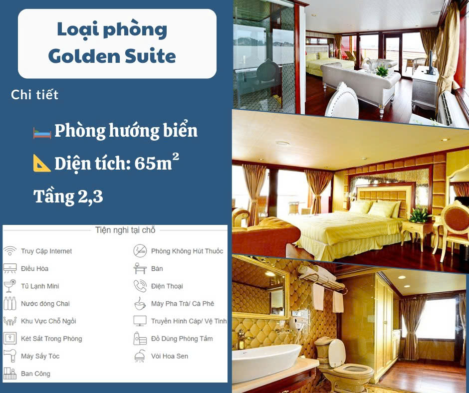 Du khách đang muốn tìm kiếm kỳ nghỉ trên một trong những du thuyền tốt nhất ở Vịnh Hạ Long thì không nên bỏ qua Golden Cruise. Con tàu gây ấn tượng mạnh ngay từ cái nhìn đầu tiên với thiết kế đậm chất hoàng gia Việt Nam, màu vàng bắt mắt và hình đầu rồng uy nghiêm - biểu tượng của văn hóa Việt Nam.