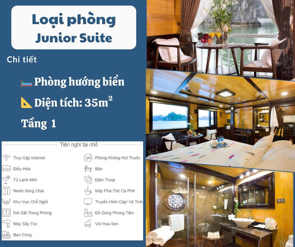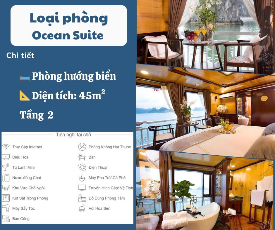 12:00 | Embark on the Hera Grand Luxury Cruise. Receive a warm welcome from the crew with a refreshing drink and cold towel. The cruise sets sail, beginning your journey through the majestic scenery of Ha Long Bay. Admire dramatic limestone islets on the way to Luon Cave and Titop Island.