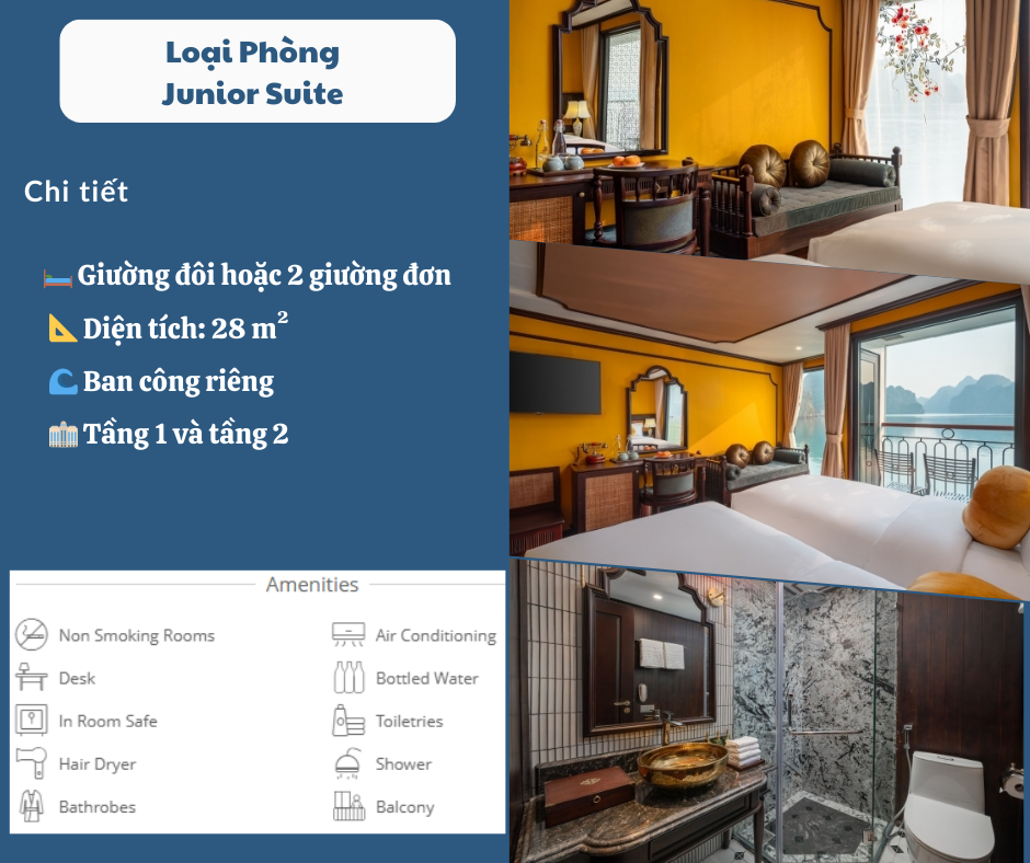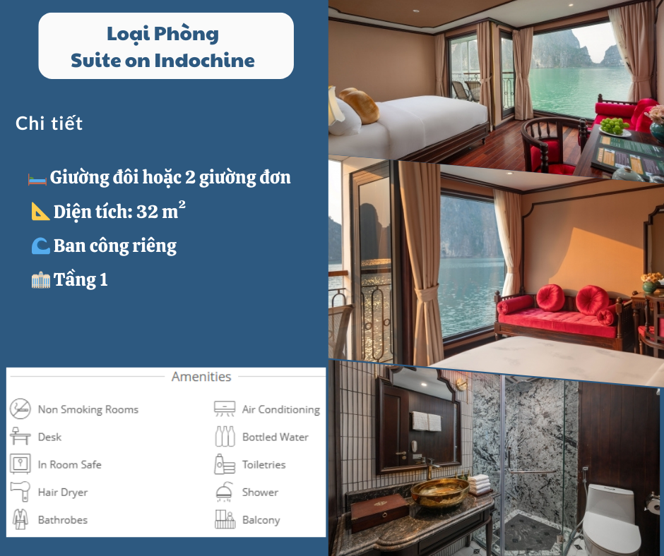 Indochine Grand Cruise – siêu phẩm mới nhất của chuỗi du thuyền Indochine, chính thức ra mắt năm 2025, du thuyền là biểu tượng của sự xa hoa và tinh tế trên vịnh Lan Hạ. Được thiết kế 32 phòng suite đẳng cấp, mỗi chi tiết trên du thuyền đều mang đậm nét nghệ thuật Đông Dương, kết hợp hoàn hảo giữa sự sang trọng và nét hoài cổ tinh tế, mang đến một không gian thư giãn tuyệt vời.