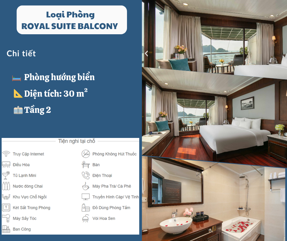 • 12:30 Quý khách thưởng thức bữa trưa, ngắm cảnh trong khi du thuyền bắt đầu hải trình khám phá Vịnh Hạ Long, một trong bảy kỳ quan thiên nhiên thế giới.