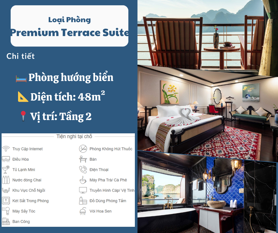 Orchid Premium mang vẻ đẹp kiêu hãnh với lối kiến trúc theo phong cách Indochine, kết hợp tinh tế giữa nét hoài cổ của truyền thống Á Đông và sự lãng mạn, lịch thiệp của kiến trúc Pháp. Được thiết kế chỉ với 5 phòng Suite cực kỳ rộng rãi có ban công và bồn tắm riêng hướng Vịnh, sở hữu quầy bar piano lãng mạn, dịch vụ cá nhân hoá, bể sục Jaccuzi ngoài trời cùng lịch trình thú vị, độc đáo, Orchid Premium thực sự là một “bản hòa tấu” tuyệt mỹ trên hải trình thưởng ngoạn kỳ quan thiên nhiên Vịnh Hạ Long – Vịnh Lan Hạ.