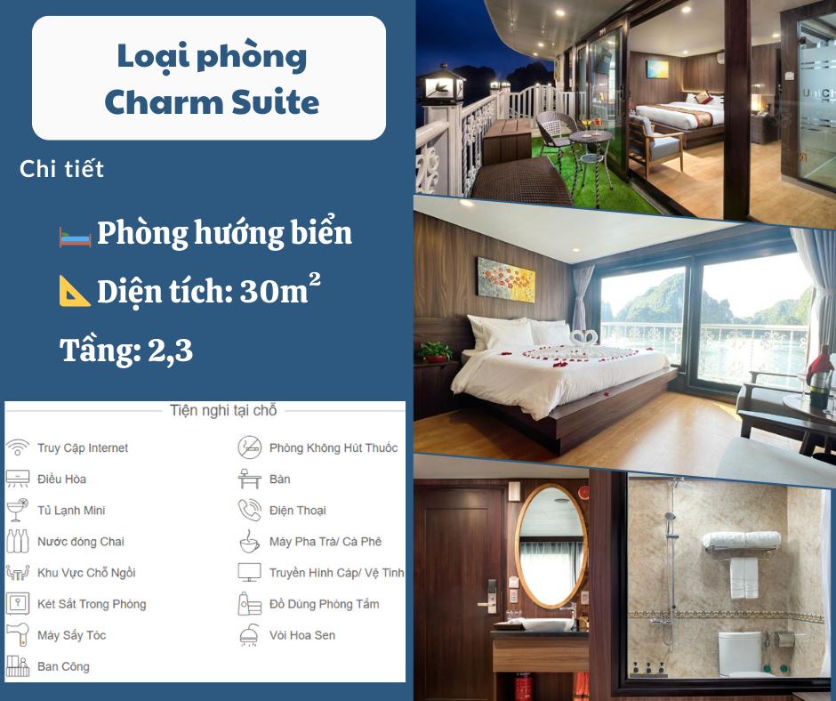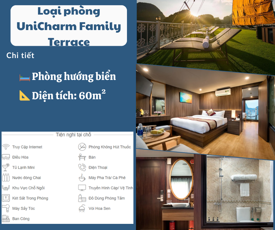 Du thuyền UniCharm với bề dày 20 năm kinh nghiệm luôn nỗ lực đổi mới đem tới những dịch vụ tốt nhất cho du khách. UniCharm là 1 trong số ít du thuyền chạy phía sau vịnh Hạ Long để tránh sự ồn ào, đông đúc, du khách sẽ có một hải trình yên tĩnh, tận hưởng không khí trong lành và thưởng ngoạn phong cảnh thiên nhiên.Du thuyền bao gồm 23 cabin với diện tích vừa phải, mỗi cabin đều có cửa sổ kính rộng hướng biển. Phòng ngủ được lát sàn gỗ, thiết kế sang trọng, mỗi phòng có ban công riêng trừ phòng gia đình và có thể kê thêm giường phụ nếu được yêu cầu. Nhà hàng trên du thuyền với sức chứa 48 khách phục vụ các món đặc sản Việt, Âu, hải sản tươi sống giúp du khách có những bữa ăn ngon nhất trên tàu.