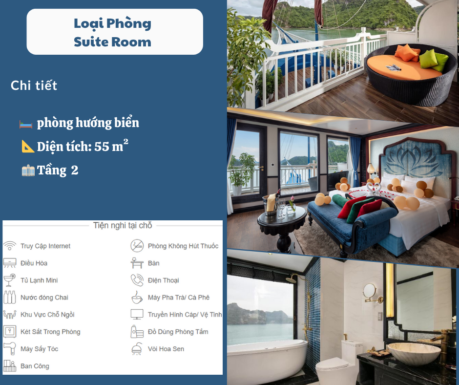 Verdure Lotus Luxury Cruise có khu vườn, sân hiên, nhà hàng và quầy bar ở Hạ Long. Ngoài Wi-Fi miễn phí, du thuyền 5 sao này còn cung cấp dịch vụ phòng và quầy lễ tân 24 giờ. Chỗ nghỉ này cung cấp trung tâm spa, karaoke và dịch vụ tiền sảnh. Tại du thuyền, tất cả các phòng đều có ban công. Ngoài phòng tắm riêng, vòi xịt/chậu rửa vệ sinh và đồ vệ sinh cá nhân miễn phí, các phòng tại Verdure Lotus Luxury Cruise đều có view biển. Tất cả các căn tại chỗ nghỉ có điều hòa và bàn làm việc. Chỗ nghỉ có phục vụ bữa sáng thực đơn buffet, thực đơn à la carte hoặc kiểu lục địa. Verdure Lotus Luxury Cruise cách Cảng Tuần Châu 3.7 km và Cáp treo Nữ Hoàng 14 km.