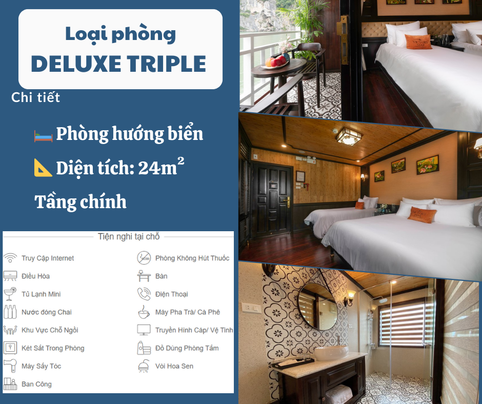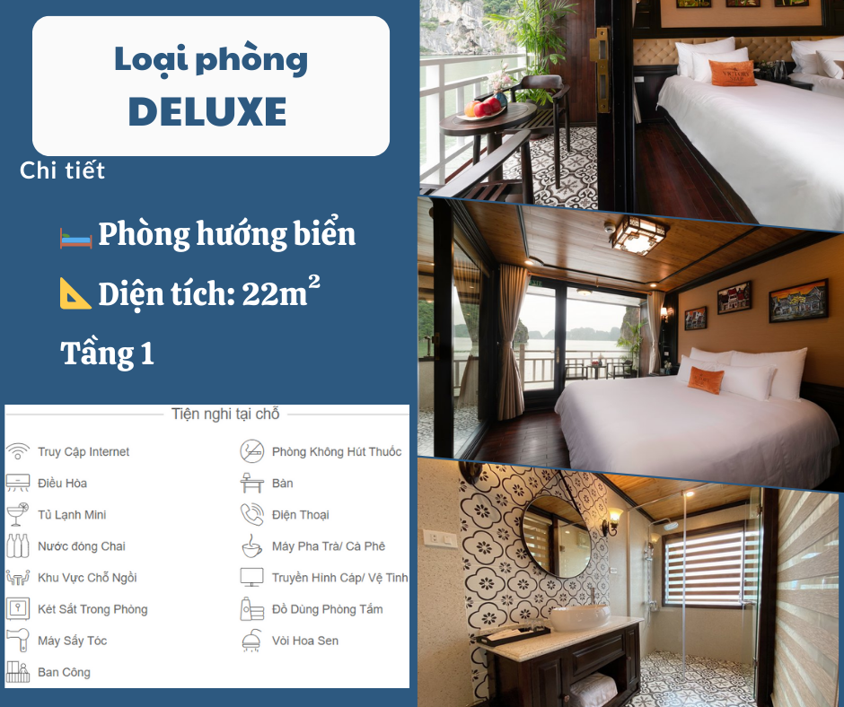 Du thuyền Victory Star là một trong những du thuyền được đóng mới bằng kim loại đầu tiên trên Vịnh Hạ Long, là niềm tự hào của Công ty Vận Chuyển khách Bài Thơ. Với 2 du thuyền 32 phòng & 24 phòng, Victory Star mang đên cho du khách kỳ nghỉ trong một không gian sang trọng, tiện nghi, đậm chất văn hoá Việt Nam.