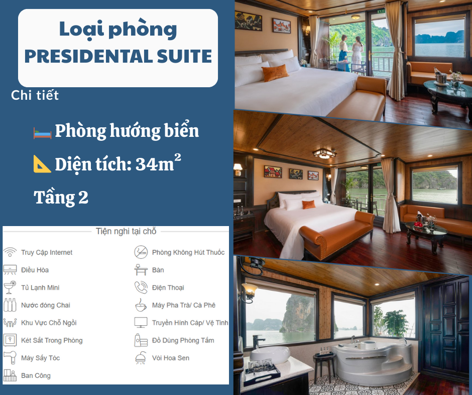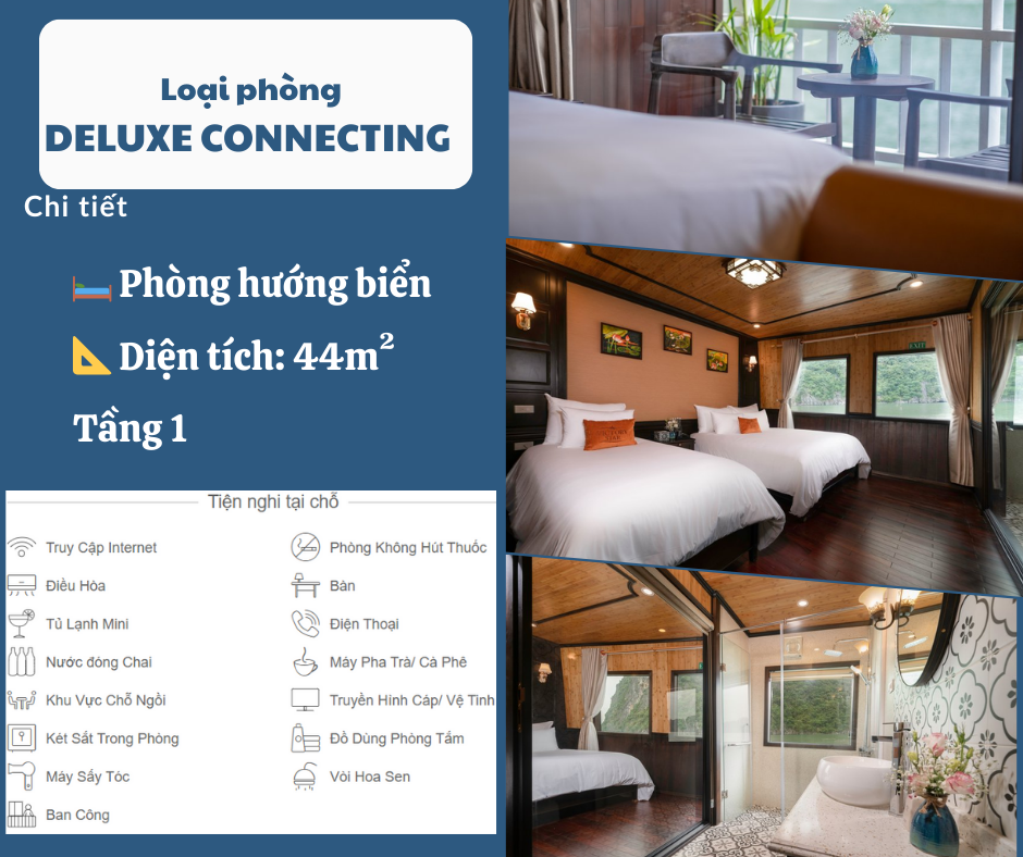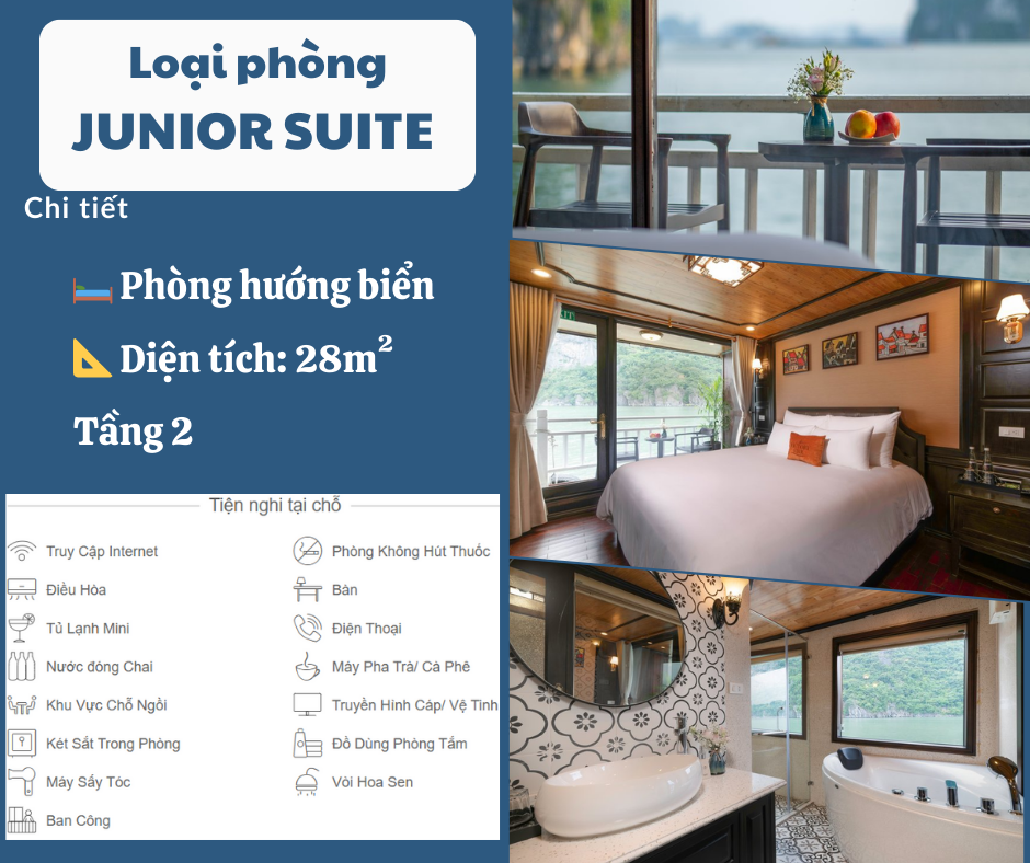 Các phòng nghỉ của du thuyền được trang bị đầy đủ tiện nghi, với ban công riêng, phòng tắm riêng không khác gì các khách sạn hạng sang. Với một căn phòng hướng vịnh bạn sẽ hoàn toàn được thoải mái nghỉ ngơi một cách riêng tư trong căn phòng của mình.