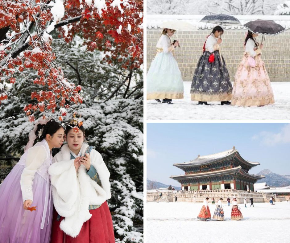 Một trải nghiệm không thể bỏ lỡ khi đến Gyeongbokgung là mặc hanbok truyền thống để chụp ảnh. Du khách có thể thuê hanbok tại các cửa hàng quanh cổng chính Gwanghwamun hoặc khu Bukchon gần đó. Giá thuê dao động khoảng 10.000 – 20.000 won (180.000 – 360.000 VNĐ) cho 2 tiếng, tùy loại trang phục. Một số cửa hàng còn có dịch vụ làm tóc và trang điểm nhẹ để giúp bạn hóa thân trọn vẹn thành thiếu nữ Hàn Quốc xưa. Cảm giác dạo bước giữa cung điện trong bộ hanbok rực rỡ giữa trời tuyết trắng chắc chắn sẽ là khoảnh khắc đáng nhớ nhất trong chuyến đi của bạn.