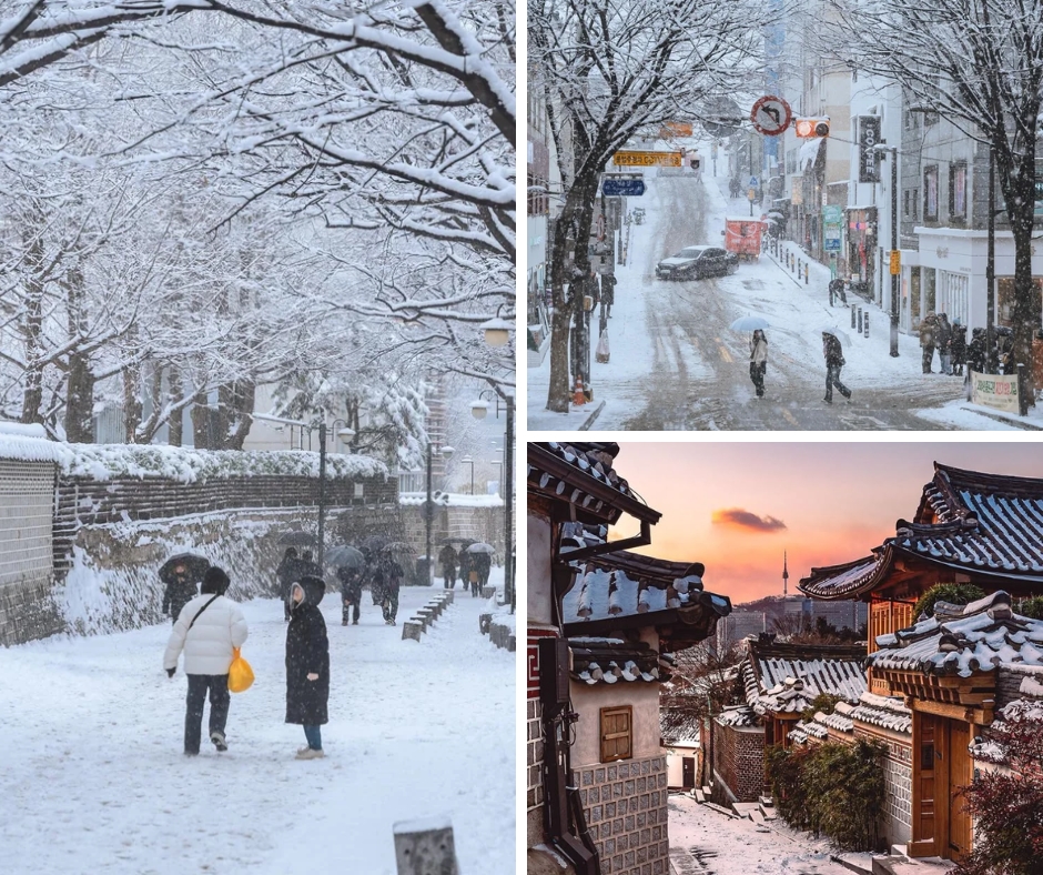 Làng Bukchon Hanok nằm giữa hai cung điện lớn Gyeongbokgung và Changdeokgung, là khu phố cổ lưu giữ hàng trăm ngôi nhà Hanok truyền thống được bảo tồn gần như nguyên vẹn. Những mái ngói cong phủ đầy tuyết khi vào mùa đông cùng với khói trà nghi ngút tỏa ra từ các quán nhỏ, và ánh nắng dịu nhẹ len qua hàng mái gỗ tạo nên khung cảnh vừa cổ kính vừa ấm áp. Bukchon Hanok đặc biệt được yêu thích vào mùa đông bởi vẻ đẹp giao hòa giữa quá khứ và hiện tại. Tuyết rơi nhẹ khiến mọi thứ trở nên tĩnh lặng, và chỉ cần dạo bước chậm rãi trên con đường lát đá, bạn sẽ cảm nhận rõ nhịp sống yên bình của Seoul giữa mùa tuyết.