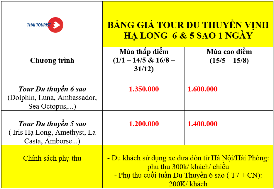 Du khách về lại điểm đón ban đầu tại Hà Nội, Hải Phòng. Kết thúc chương trình tour du thuyền 5 sao thăm vịnh Hạ Long 1 ngày. Thai Tourist xin chào tạm biệt & hẹn gặp lại!